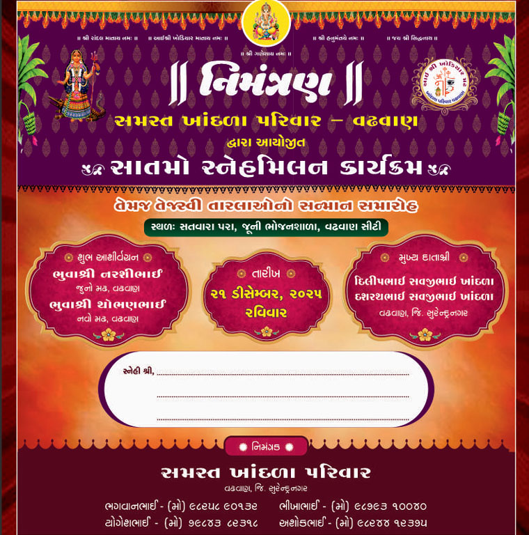સમસ્ત ખાંદળા પરિવાર - વઢવાણ દ્વારા આયોજીત
